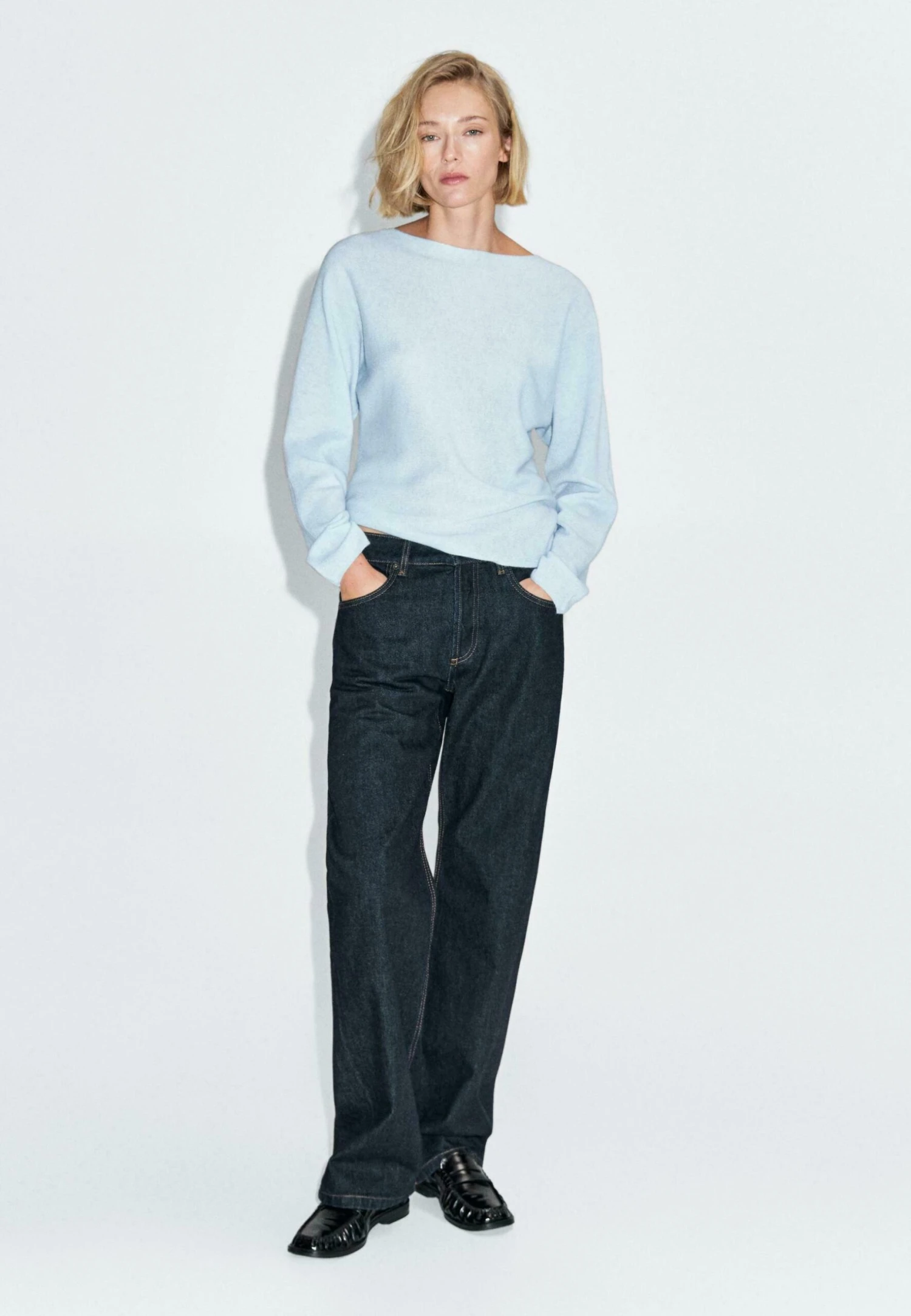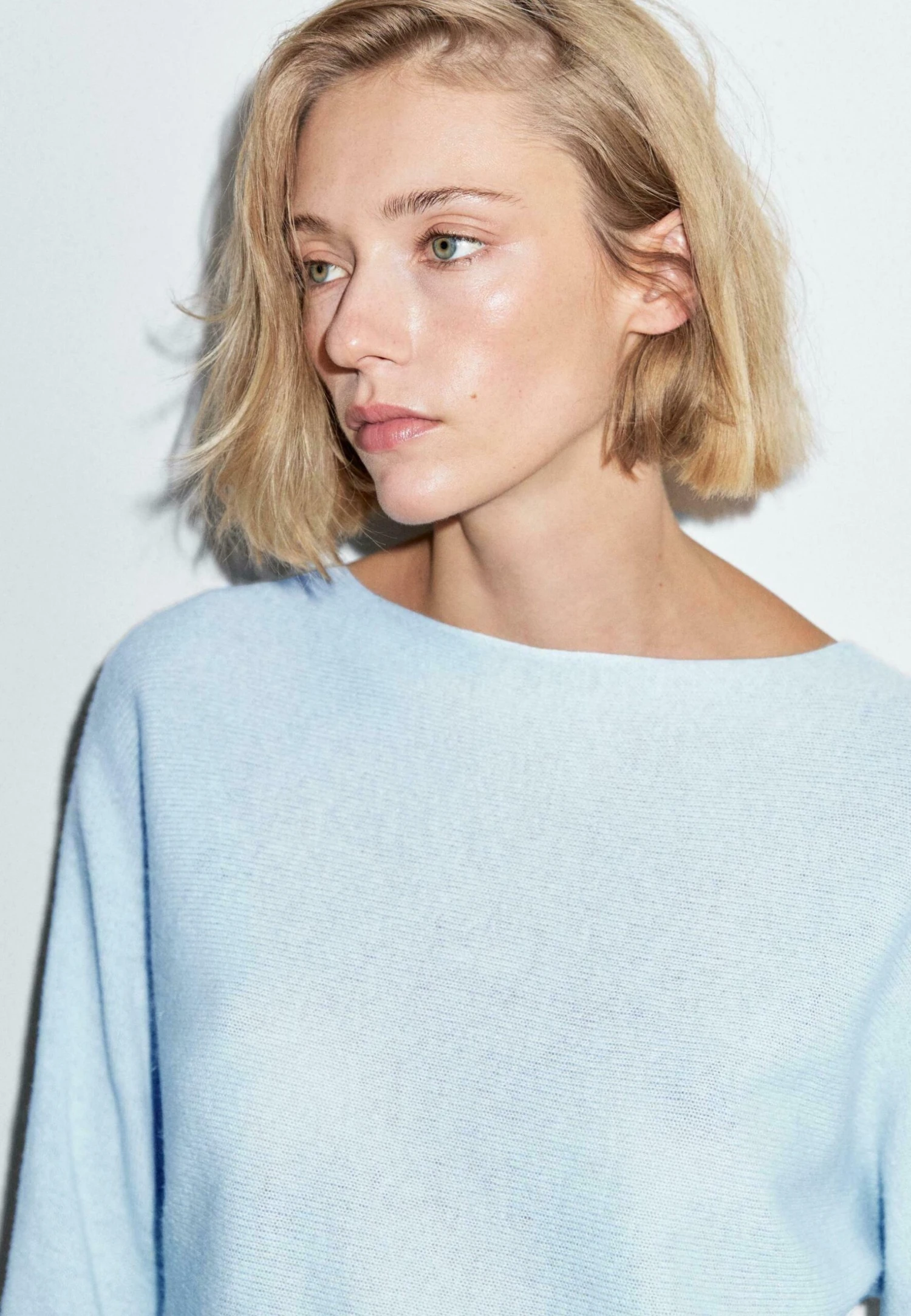 - Neckline: Boat neck