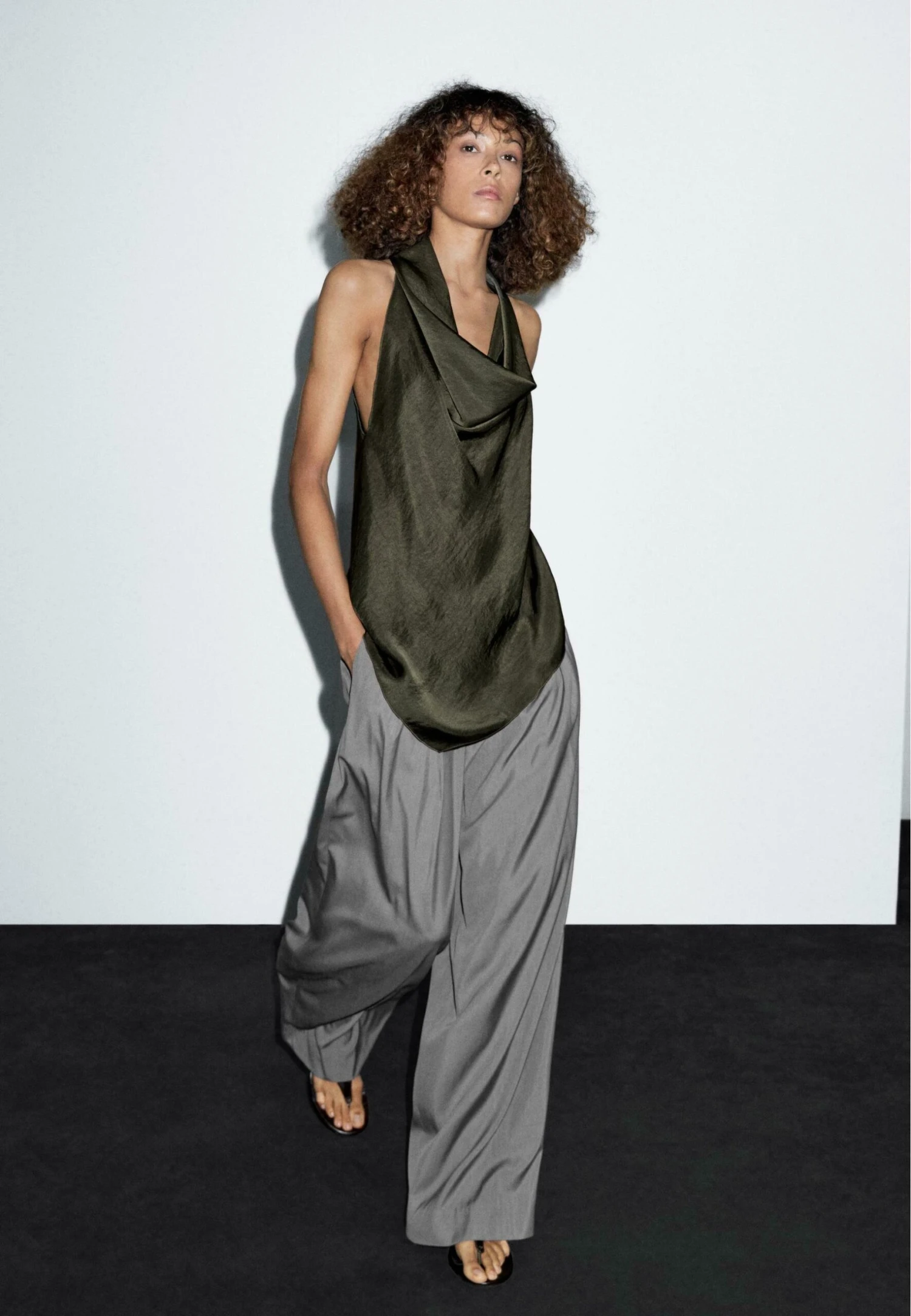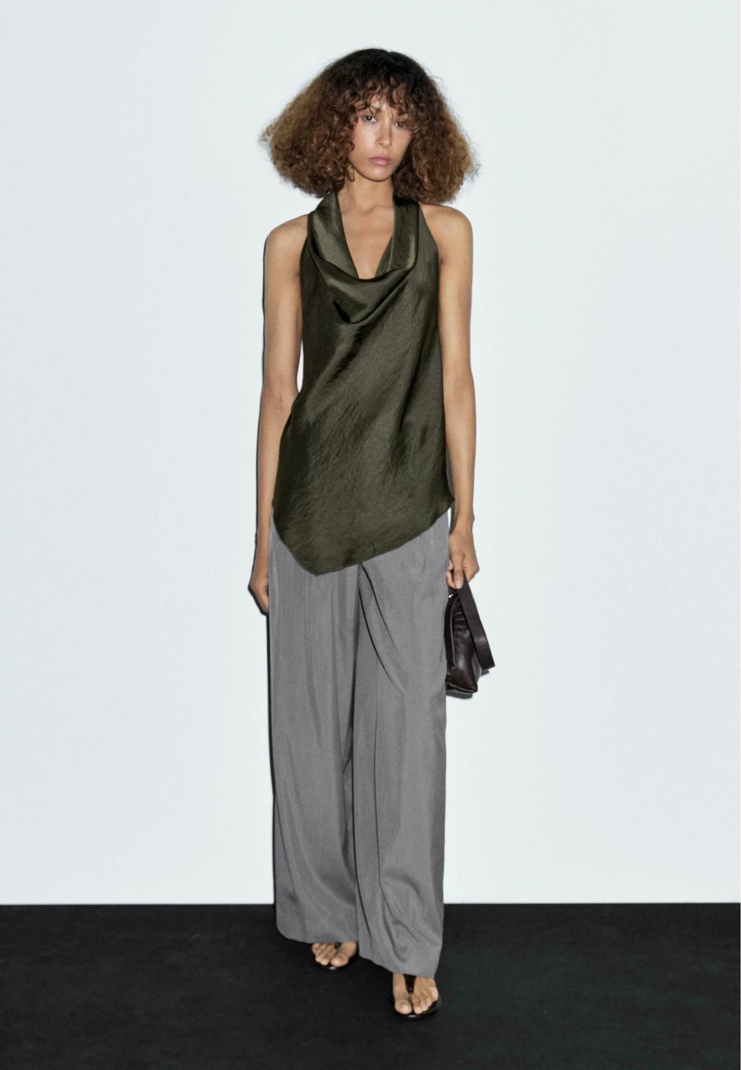 - Neckline: Cowl neck