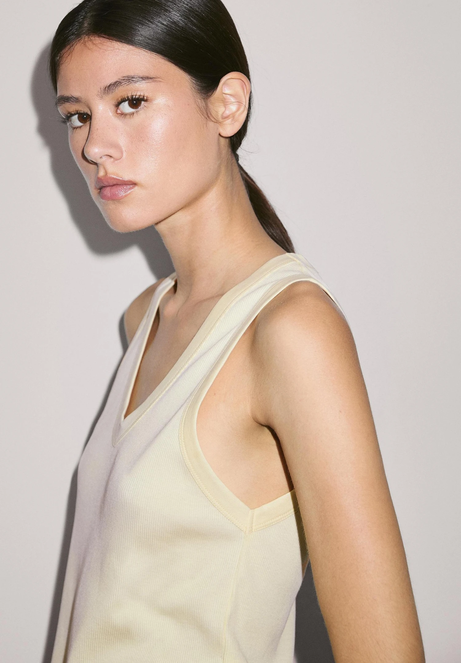 - Neckline: Low-cut v-neck